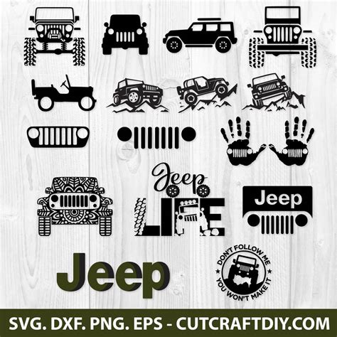 - The collection includes a variety of Jeep-themed designs, such as logos, silhouettes, and phrases.