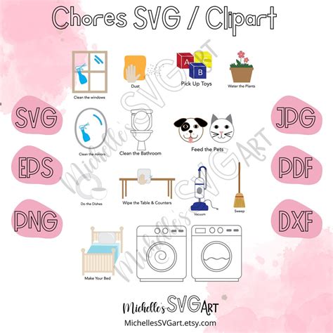 Our Charming Chores SVGs include a wide range of household tasks, from daily chores like making the bed and doing dishes to weekly tasks like laundry and vacuuming. You can also customize the chore chart to include specific tasks that are unique to your home and family.